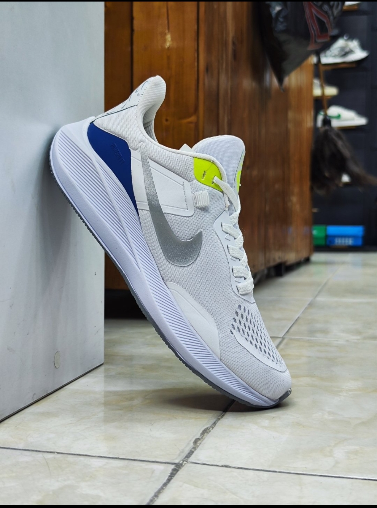 کفش کتانی مردانه نایک زوم سفید آبی با زیره eva رویه اسپیسر وارداتی و کفی طبی